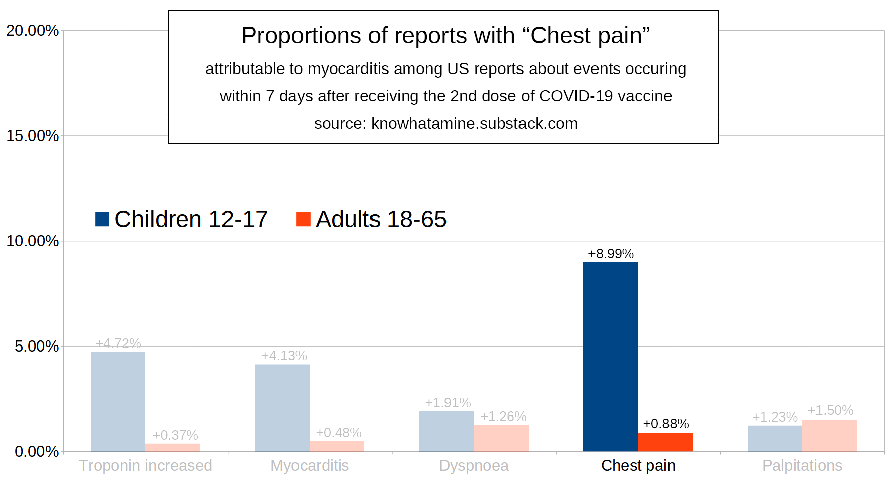 After determining the proportion of adverse events that mention “Chest pain” among reports about adverse events occuring within 7 days after administration of the 2nd dose, we will try to estimate what proportion of those events can be attributed to myocarditis caused by the COVID-19 vaccine and apply the 7-day-dose-2 underreporting factor to determine the incidence proportion of children suffering myocarditis within 7 days after receiving their second dose.